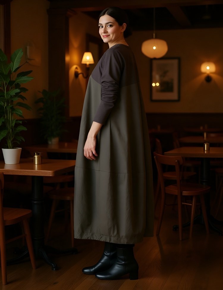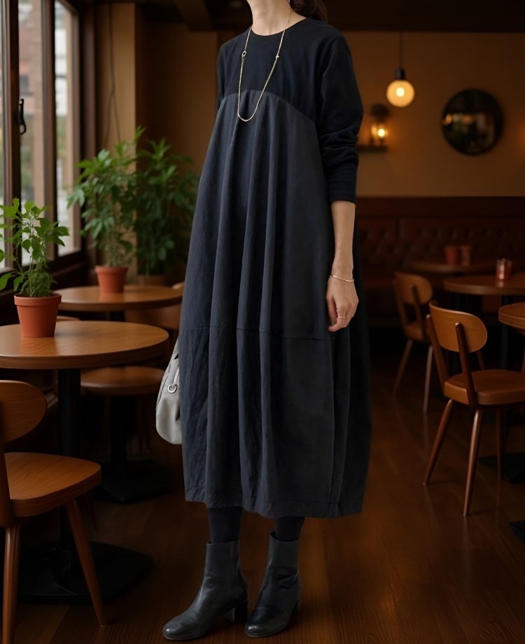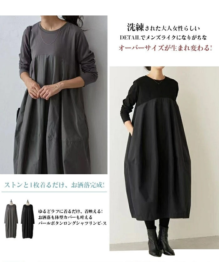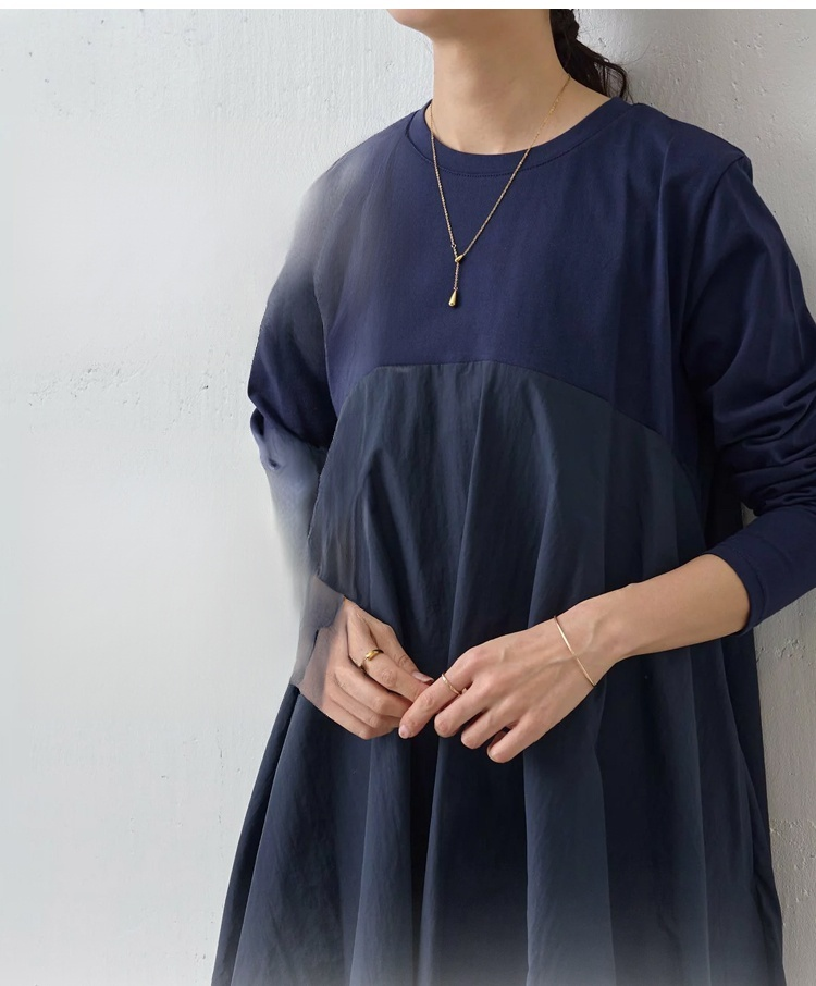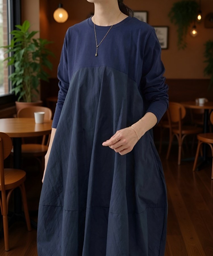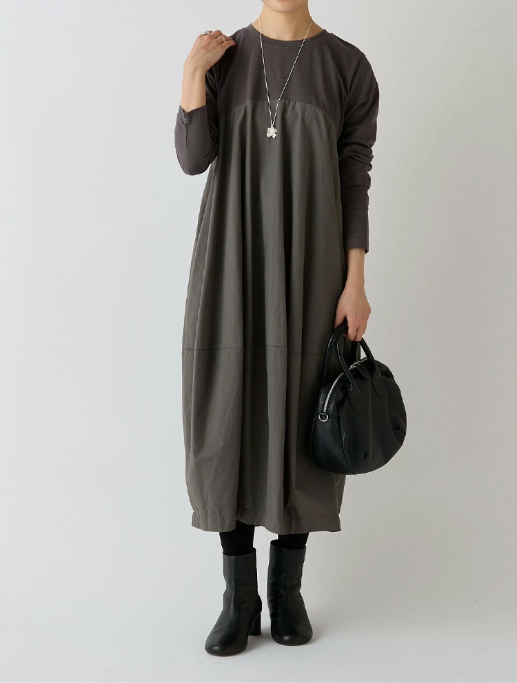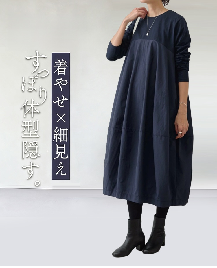 大きいサイズの長袖クルーネック切り替えワンピース